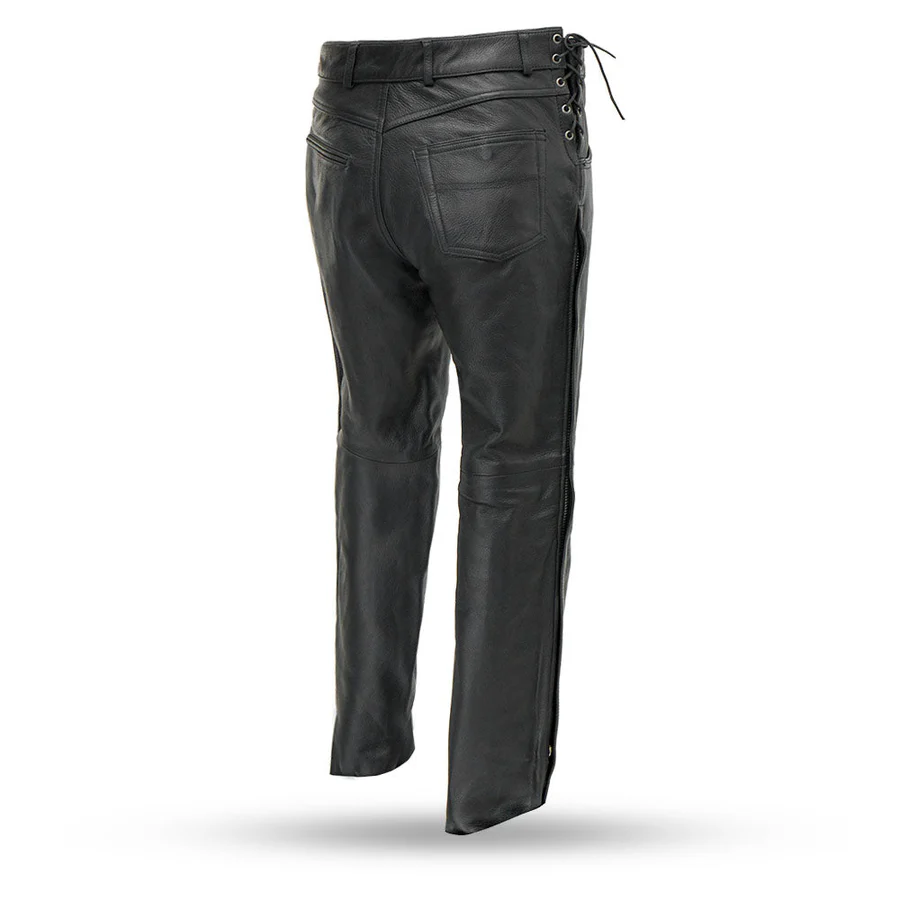 The Ron appear to be full leather pants, but come with the features of chaps. These are generously sized so you can wear them OVER your regular pants, just like chaps. These feature side lacing and a zipper down the legs, along with two front pockets. One standard traditional pocket in the back along with a zippered pocket. Get the benefits of pants and chaps in one!